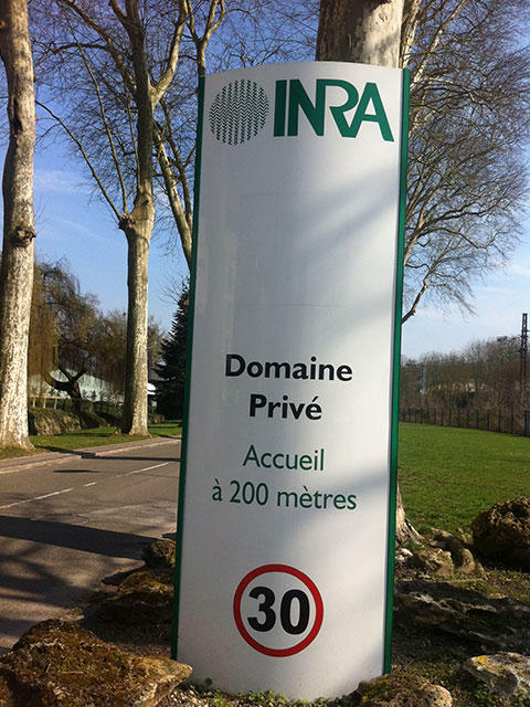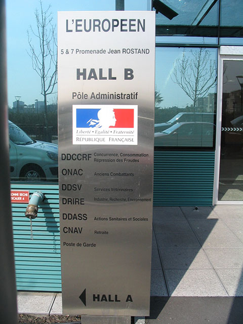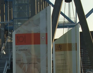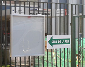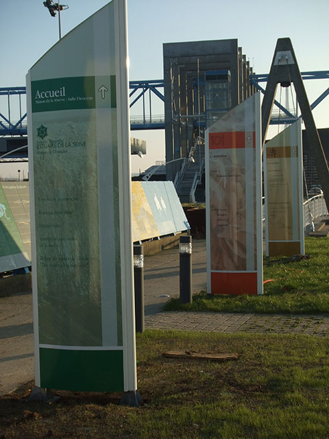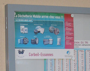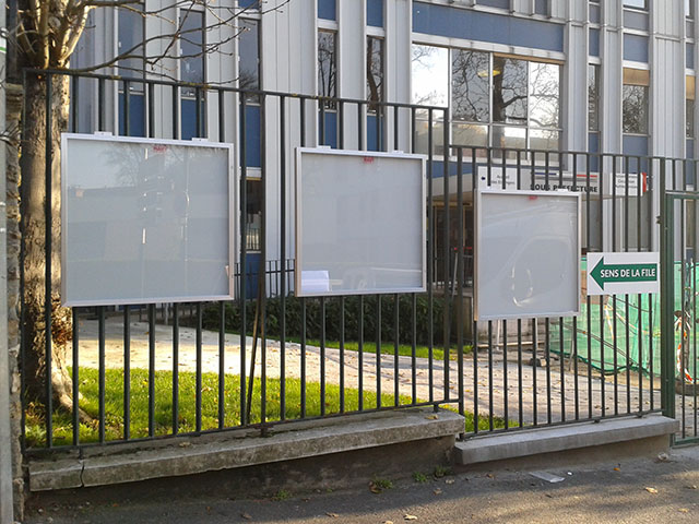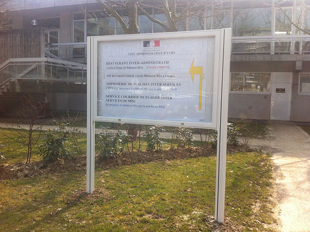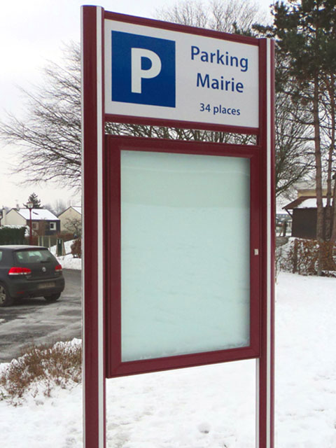 vitrine d'affichage sur bi-mâts, thermolaquage, indication en partie haute