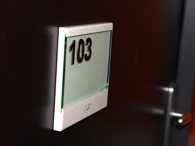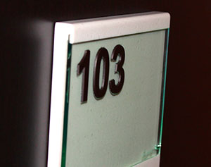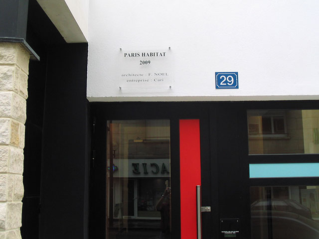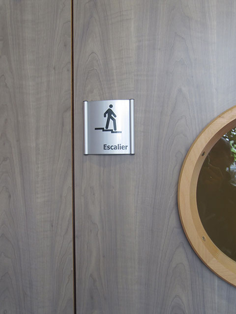 plaque de porte en aluminium anodisé naturel, logo et texte en adhésif